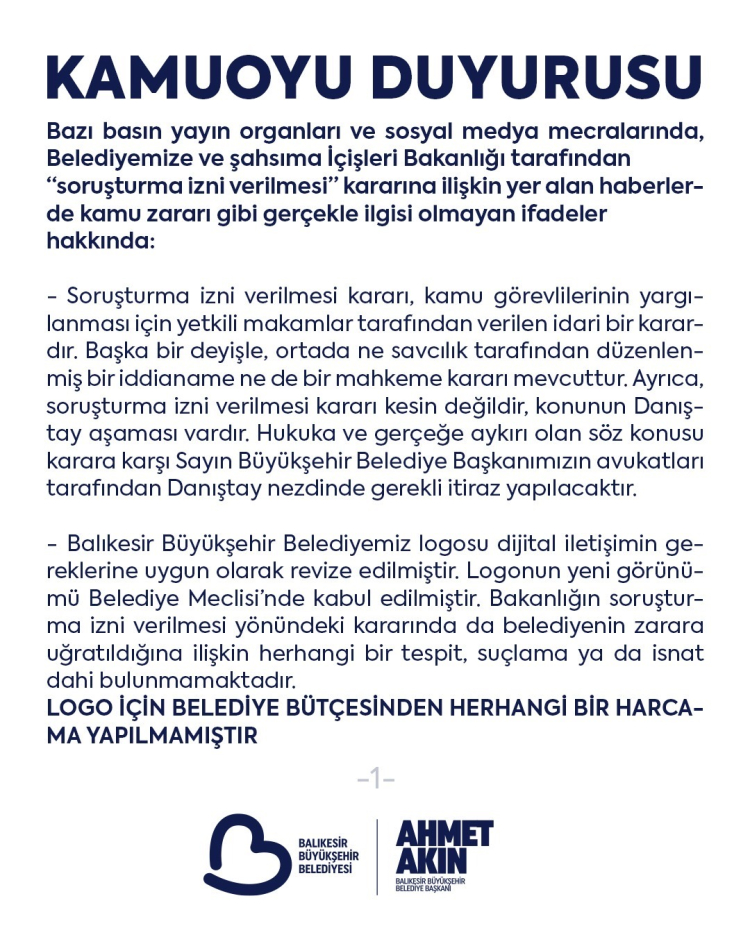 Akın, sürece ilişkin; logo tasarımı için belediye bütçesinden hiçbir harcama yapılmadığını, logo değişikliği nedeniyle tabela, basılı evrak veya materyaller imha edilmediğini ve 480 milyon liralık bir harcama yapıldığına dair iddiaların tamamı gerçeği yansıtmadığının altını çizdi.