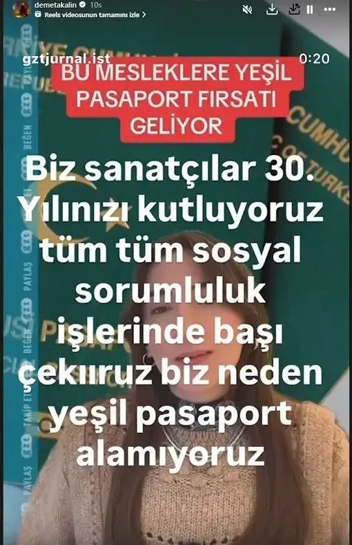 Ünlü şarkıcı Demet Akalın, GZT tarafından yayınlanan bir videoyu alıntılayarak, mesleğinde 15 yılını dolduran mühendis ve mimarlara yeşil pasaport verilmesiyle ilgili tepkisini dile getirdi. Akalın, sanatçıların toplumsal olaylara aktif katılımına ve mesleki deneyimlerine vurgu yaparak, “Sanatçılar olarak 30. yılımızı kutluyoruz. Sosyal sorumluluk projelerinde liderliğimizi konuşturuyoruz. Peki, neden yeşil pasaport alamıyoruz?” dedi.