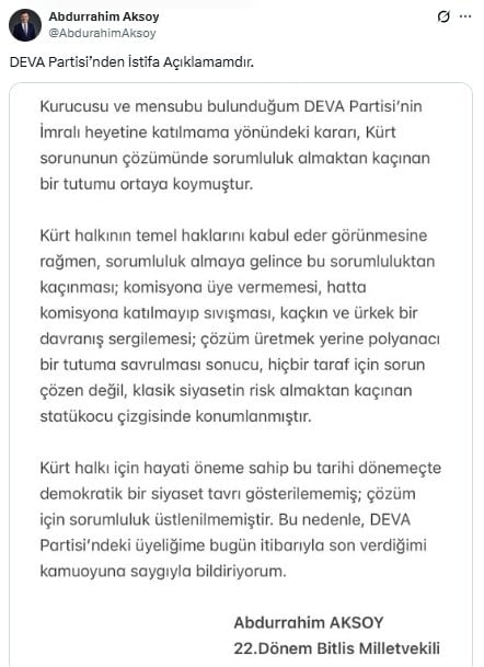 DEVA Partisi kurucularından 22. Dönem Bitlis Milletvekili Abdurrahim Aksoy partisinden istifa ettiğini açıkladı.